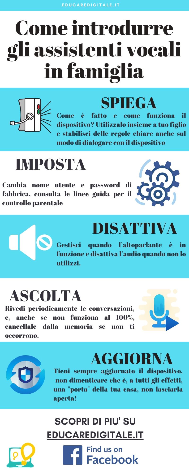Nell’Infografica ho raccolto alcuni suggerimenti pratici per introdurre e gestire un assistente vocale in casa.